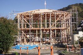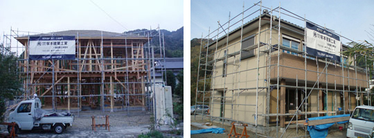 (右)外壁工事が完了しました。内部も順調に作業が進んでいます。